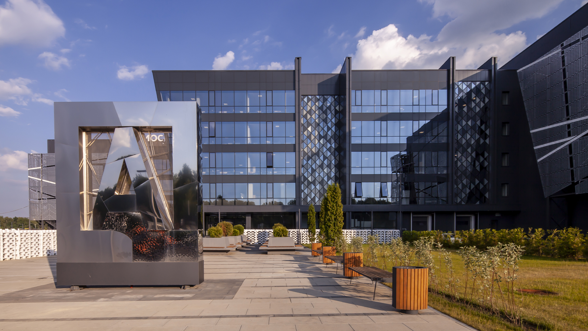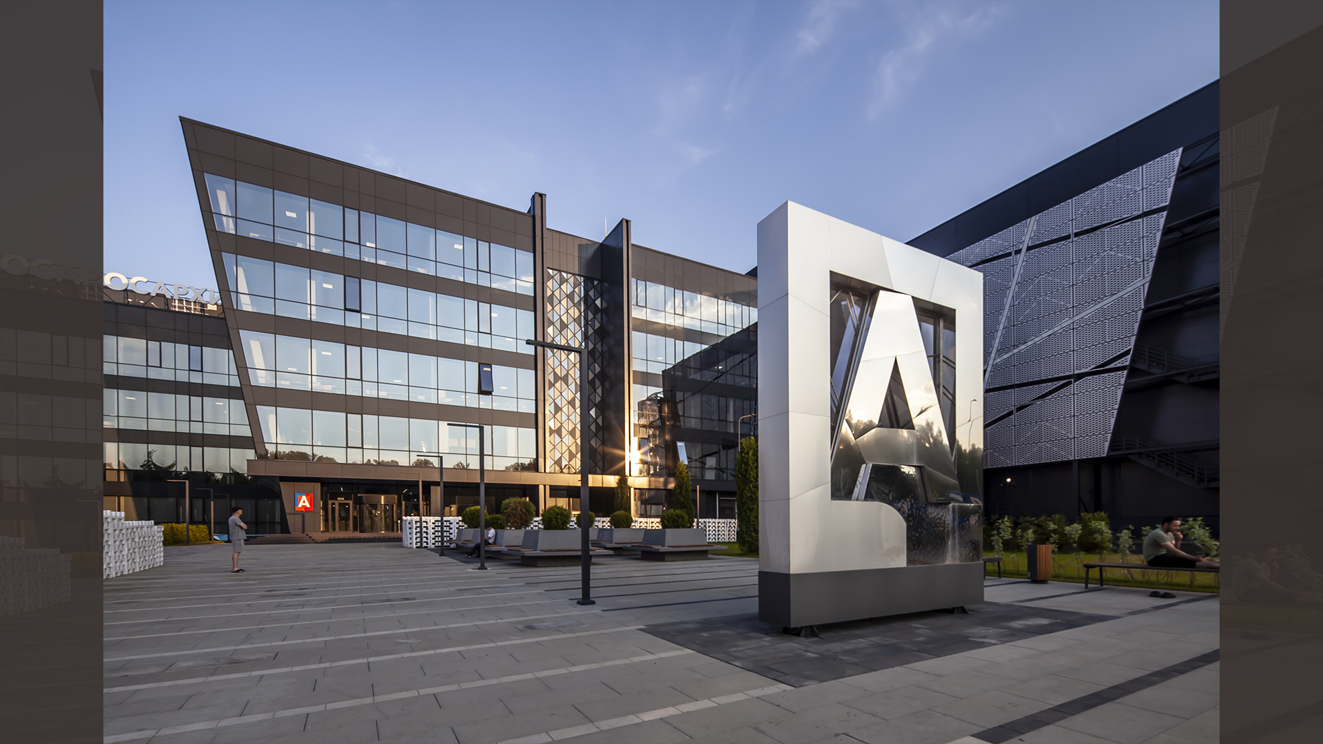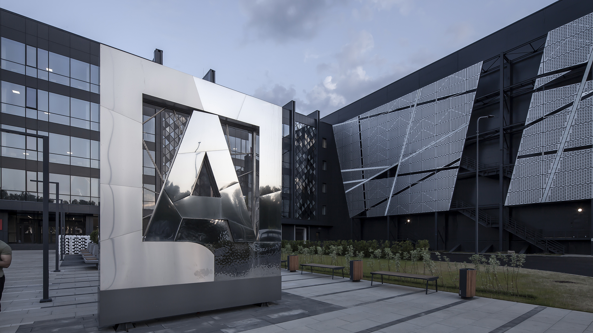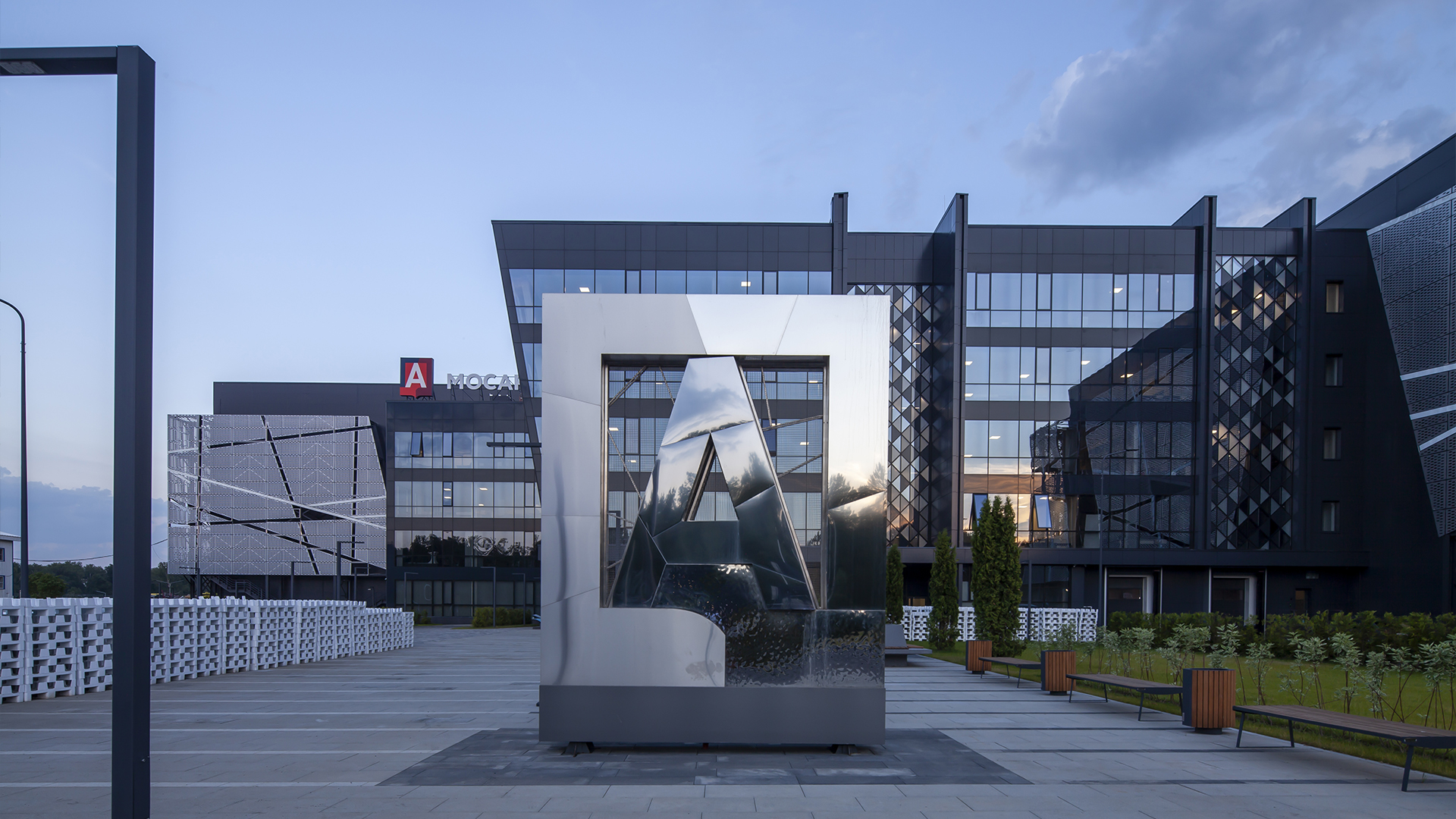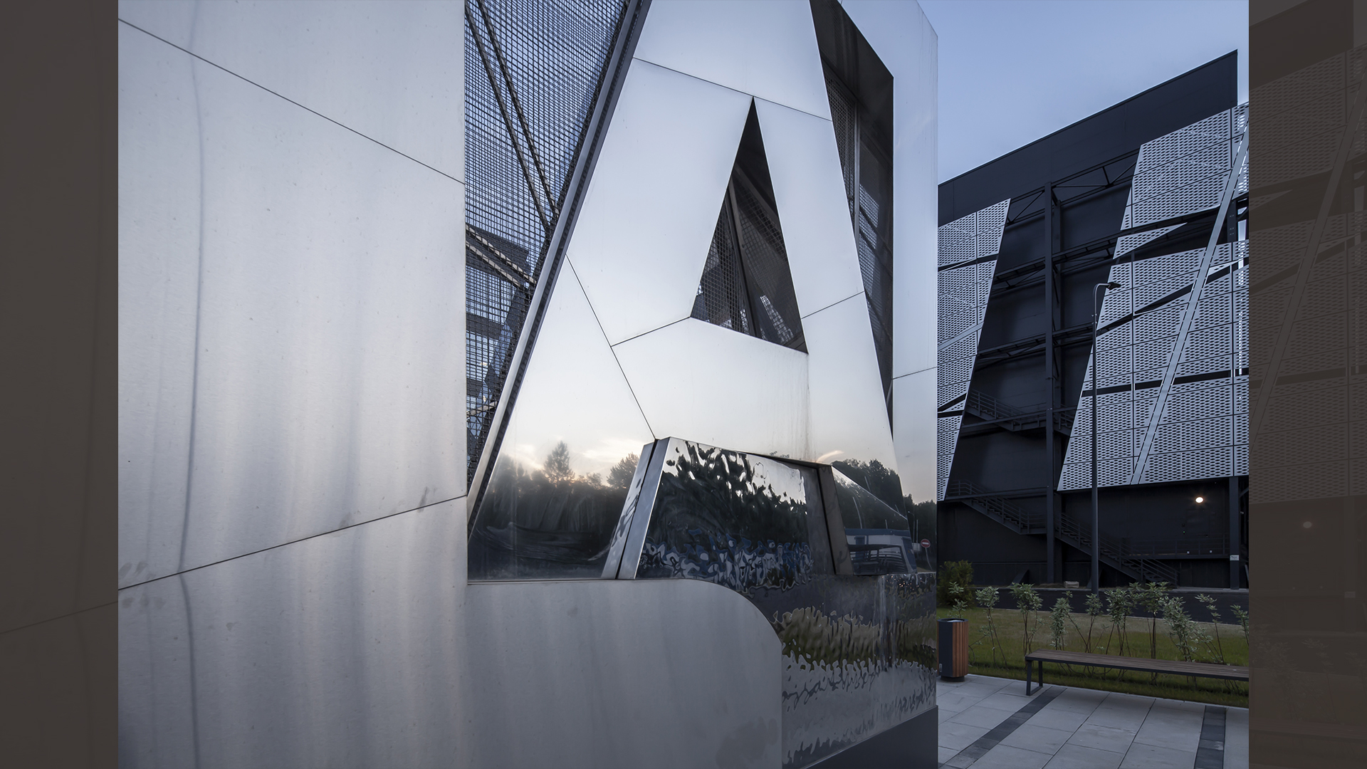 Street stele made of three types of stainless steel with night illumination in the form of the logo of the Main Archive Department