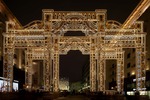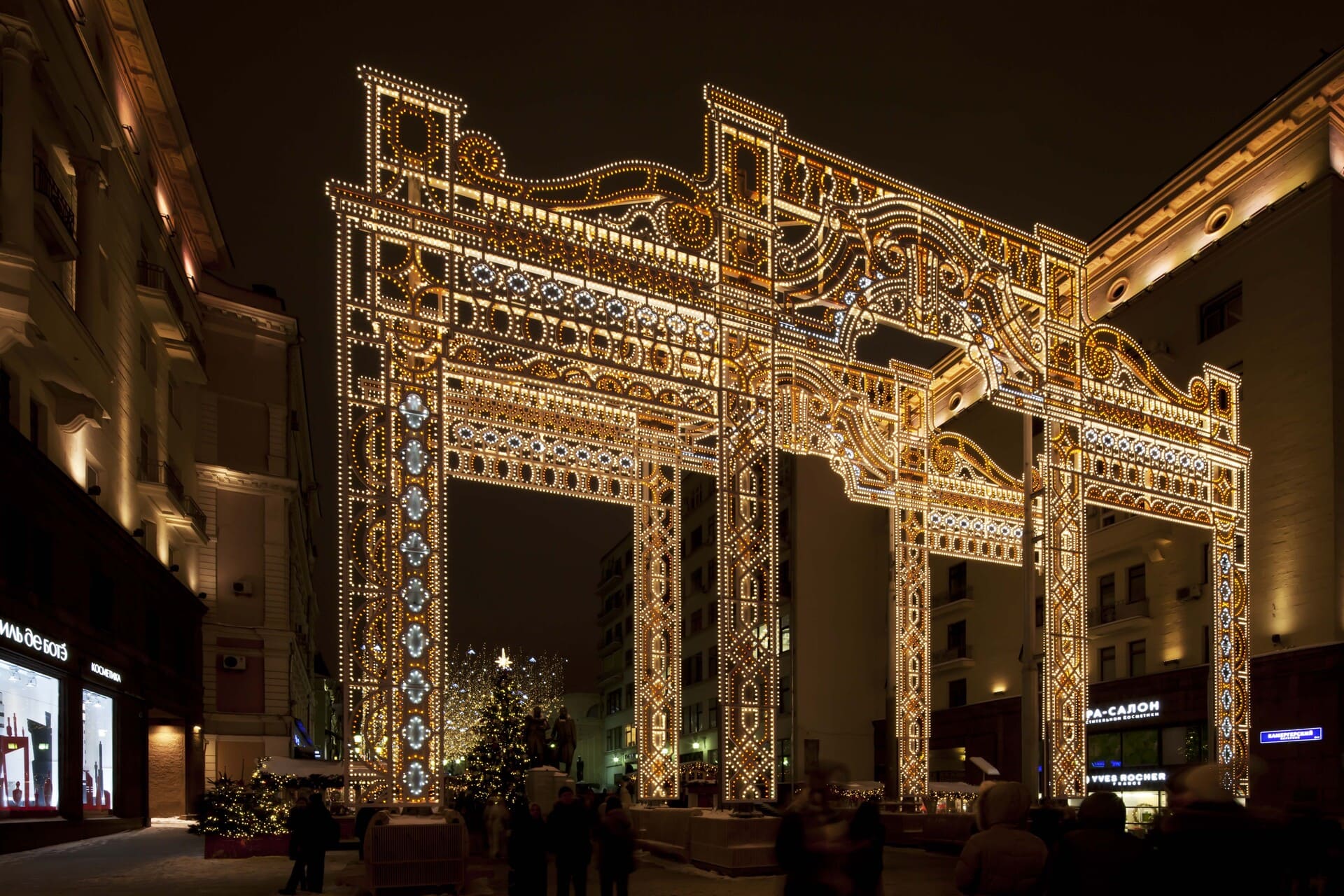 At the exit on Tverskaya Street, two symmetrical 25-meter light arches were installed, made in the style of the Chekhov Moscow Art Theater located nearby. Arches overlap with each other and differ in the folds of the curtain.